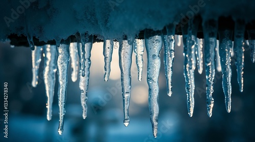 Icicles hanging down in a chilly winter setting with soft blue tones and light background