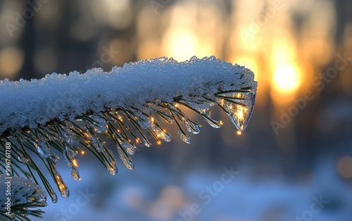 Icicles hanging from snow-covered pine needles at sunset creating a magical winter landscape