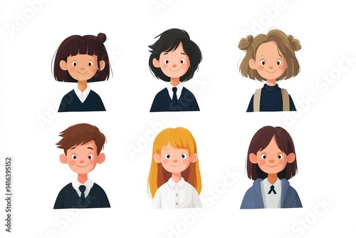 Icon Avatar Set of Children with Different Hairstyles and School Uniforms on a White Background