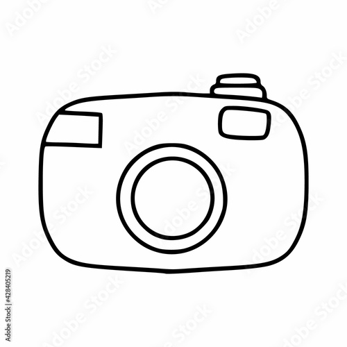 Icon camera in the style of Doodle. Cute camera with a black contour line. Hand-drawn drawing.