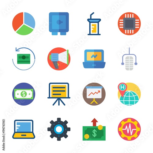 icon Digital Marketing with money, microchip, safebox, presentation and worldwide