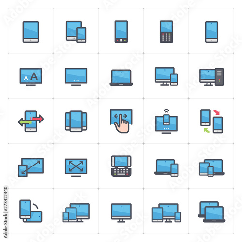 Icon set - device and responsive outline stroke full color vector illustration on white background