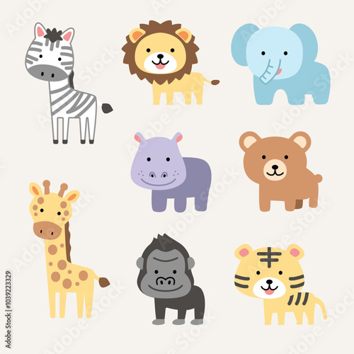 Icon set bundle collection animals zoo forest wildlife simple illustration drawing kiddy children tiger, gorilla, elephant, bear, zebra, giraffe, lion