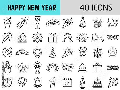 Icon set celebrating New Year with festive symbols and decorations