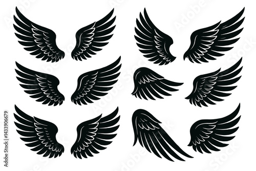 Icon set featuring various styles of black wings for creative design projects and artistic applications