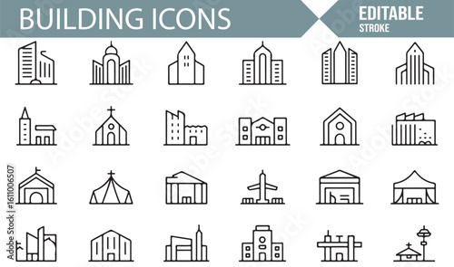 Icon Set for Various Building Types Including Homes, Offices, and Temples