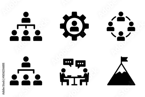 Icon set illustrating teamwork and organizational structures in business settings effectively