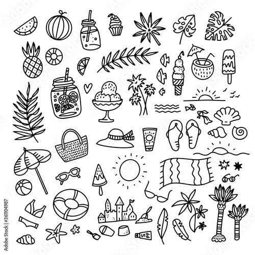 Icon set summer beach holidays, travel, vacation with sand castle, shoes, ice cream, shells, ball, drink, towel, sunglasses, parasol. Hand drawn black and white doodle vector illustration.