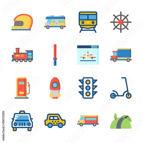 icon Transportation with rudder, traffic light, taxi, locomotive and plane