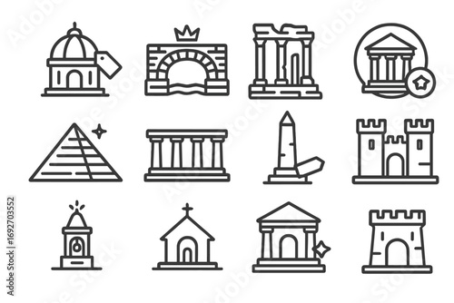 Iconic Architectural Illustrations. Line style icons of old architecture: dome structure with tag, brick bridge with crown,