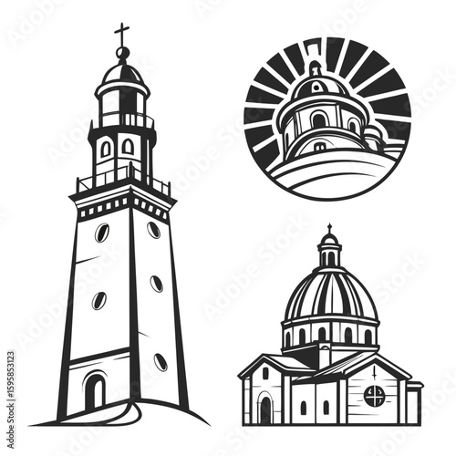 Iconic architectural structures with black brush strokes architecture building