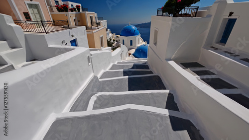 Iconic Santorini staircase gracefully descends toward deep Santorini blue sea under clear sky. Whitewashed steps, flanked by traditional Santorini blue domes, mesmerizing Mediterranean atmosphere