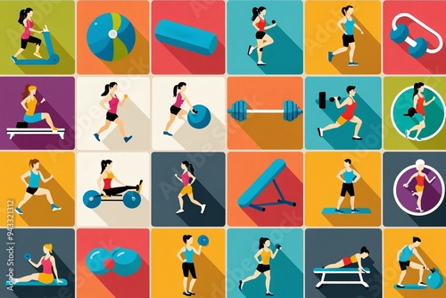 Icons depicting different fitness activities and equipment suitable for health and wellness infographics