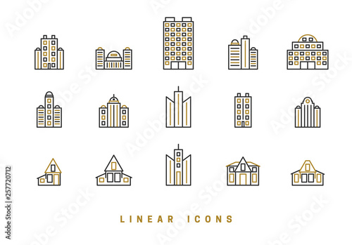 Icons houses, high-rise buildings in linear style. Architectural structure of home skyscrapers icon vector graphic