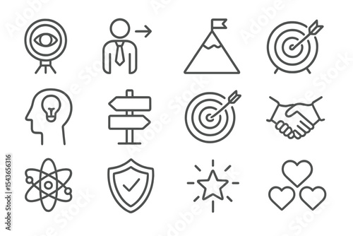 Icons illustrating concepts of success, strategy, teamwork, and innovation in a minimalist design style