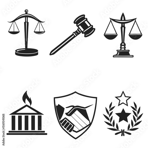 Icons of law, justice, and agreement isolated on white background