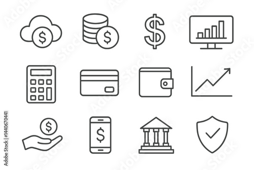 Icons representing financial technology including banking, transactions, and investment graphs in a minimalist style