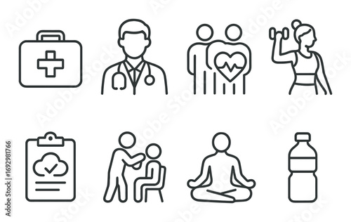Icons representing health, medicine, fitness, yoga, wellness, and nutrition