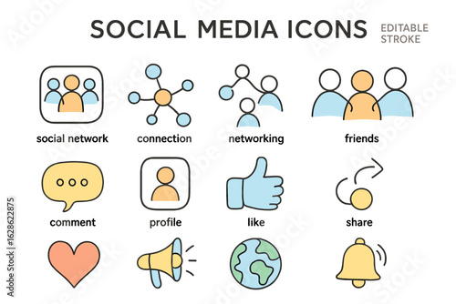 Icons representing social media activities including networking, connecting with friends, and sharing content online