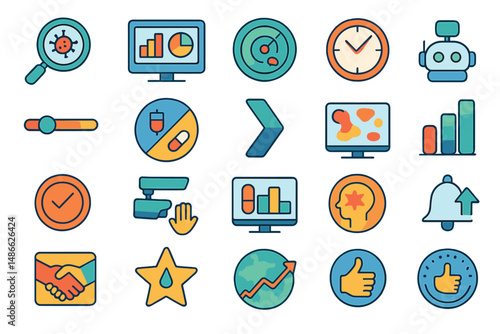 Icons representing technology, analytics, and communication in a modern digital environment with colorful designs