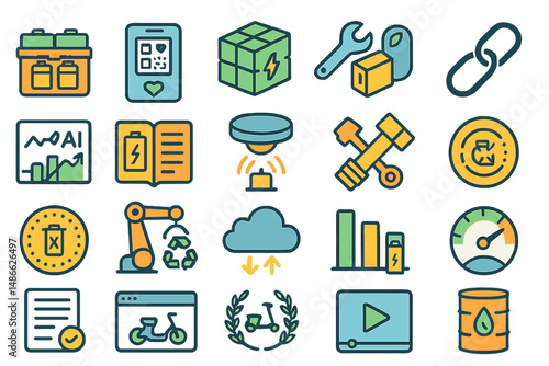 Icons representing technology, data, and recycling concepts in a modern design suitable for various applications