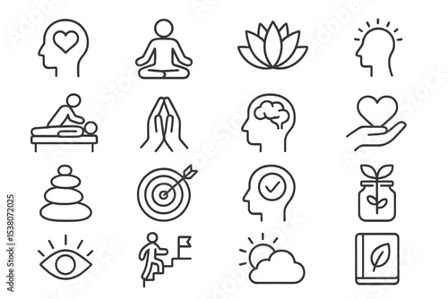 Icons representing wellness, meditation, and self-care practices in a modern design