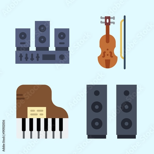 Icons set about Music with sound system, violin, speaker, announcer and piano