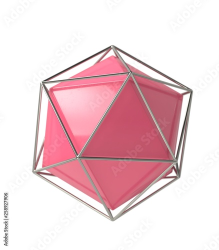 Icosahedron 3d geometric volume red solid shape in wireframe metal jail, 3d illustration