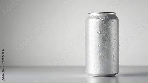 Icy Cold Silver Aluminum Can with Water Droplets on a Light Gray Background for Mockups