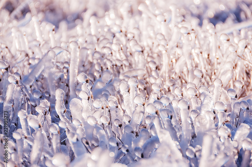 icy glistening grass in a winter glade. a magical glass winter world.
