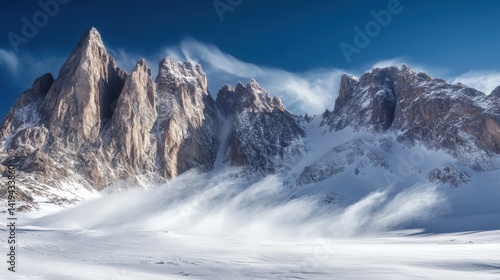 Icy mountain landscape with blowing snow, jagged peaks, and a deep blue sky, evoking a harsh, beautiful chill