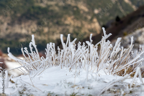 Icy plants in the mountains (Greece, Peloponnese) on a winter