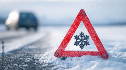 Icy Road Warning Sign Alerting Drivers to Hazardous Winter Conditions and Reduced Traction on Snowy Pavement