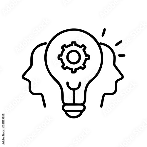 Idea generation icon with light bulb and gears, symbolizes creativity and innovation, black outline, modern design
