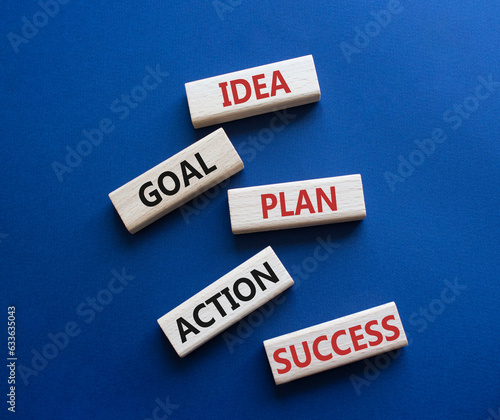 Idea Goal Plan Action Success symbol. Concept words Idea Goal Plan Action Success on wooden blocks. Beautiful deep blue background. Business concept. Copy space.