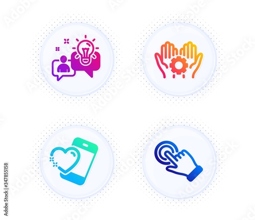 Idea, Heart and Employee hand icons simple set. Button with halftone dots. Touchscreen gesture sign. Solution, Love call, Work gear. Click hand. People set. Gradient flat idea icon. Vector