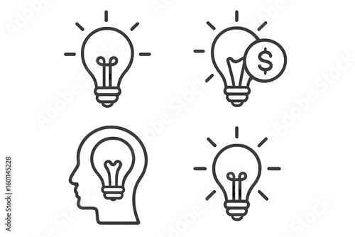 Idea icon set. Light bulb outline vector. Creativity, innovation, inspiration, thinking concept. Business solution, startup, funding, monetization with dollar sign symbol.