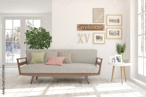 Idea of white minimalist room with sofa. Scandinavian interior design. 3D illustration