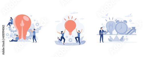 Idea Startup, people try to find best idea, Balance between time and cost of an idea, set flat vector modern illustration