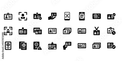 Identification and verification icon set. Vector glyph pictograms of personal ID card, passport, biometric scan, badge, document verification, security, authentication black silhouette illustration.