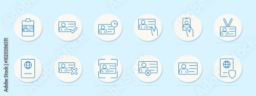 Identification set icon. Clipboard, verified ID, clock, handing, mobile ID, lanyard , rejected, passport with cross, scanned ID, passport with shield.