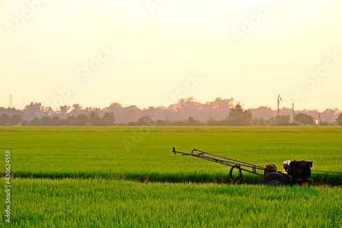 Idle walking tractor on rice field ready to be used at the beginning of rice growing season at sundown.