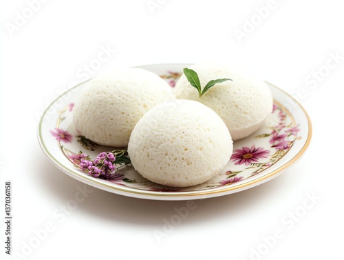 Idli Steamed Rice Cakes on Decorative Plate with Flower Garnish