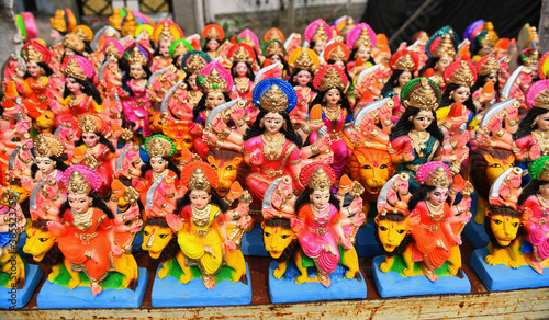 Idols of Goddess Durga sitting on Lion. The nine-day Durga Puja festival, which commemorates the slaying of the demon king Mahishasur by the goddess Durga, marks the triumph of good over evil.