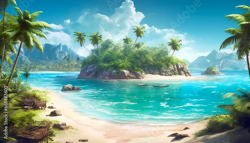 Idyllic coastline, palm trees sway, waves crash, sunset beauty generated by AI