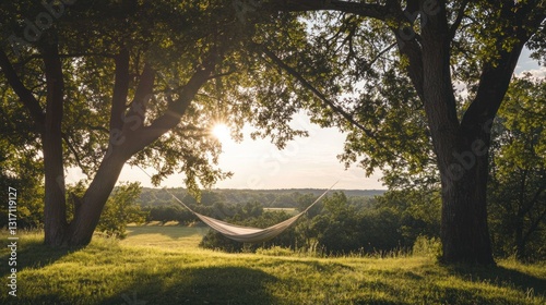 Idyllic countryside scene with a hammock strung between trees at sunset