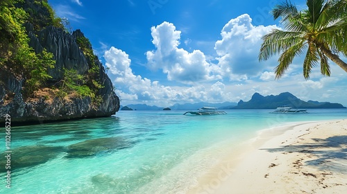 Idyllic tropical beach scene with turquoise water, boats, and limestone cliffs.