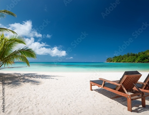 idyllic tropical beach with azure water white sand and resort loungers