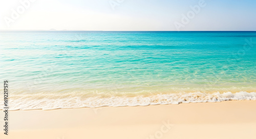 Idyllic tropical beach with crystal clear turquoise ocean and pristine white sand shore