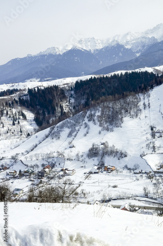 Idyllic winter landscape with mountains, sunny day; Bran, Romania